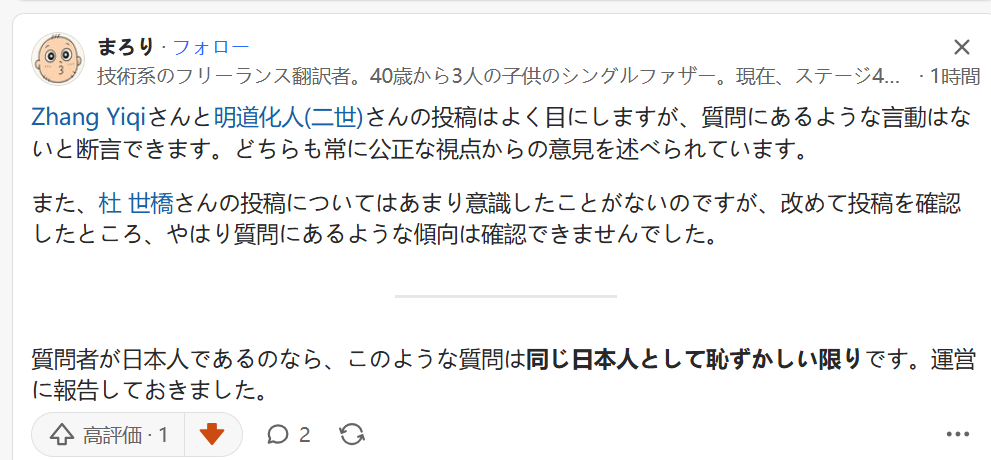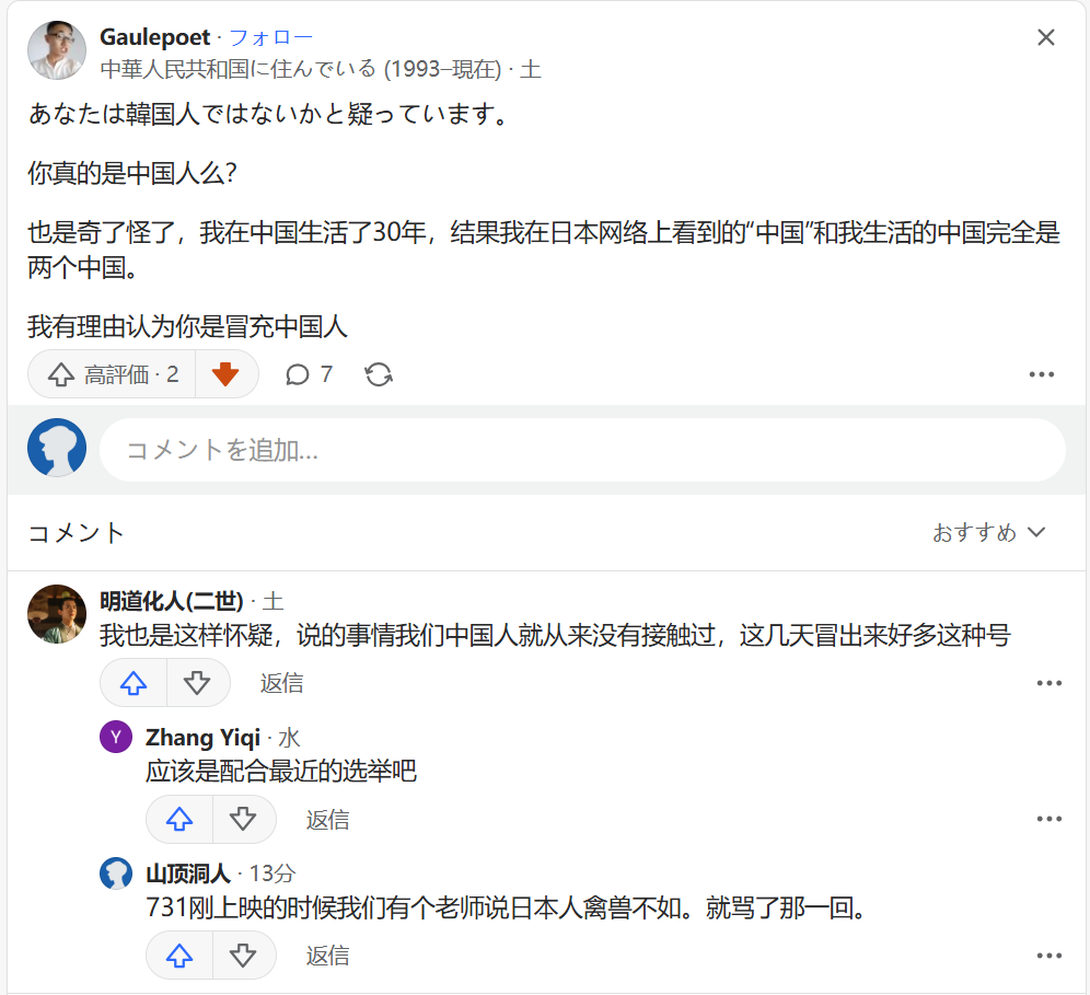 我在Quora看到过几个关于中国仇日教育的帖子,都是中国境内的学生发的。但是每次发都会有一些人来攻击他,“你真是中国人吗”“中华民族的败类”“我怀疑你是日本极右翼伪装的”“你说的根本不存在”,等等。还有人威胁举报。他们之间还互相称赞。真是无语。他们说的这些屁话我亲友都不信,包括那些粉红。