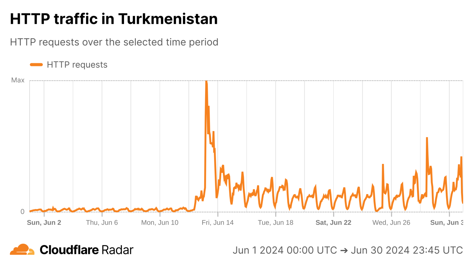 我们先来看请求数量,因为如果 IP 地址被解除封锁,请求数量应该会增加。2024 年 6 月中旬,Cloudflare 开始收到明显的 HTTP 请求增长,这与有关土库曼斯坦解除 IP 地址封锁的报道相符。