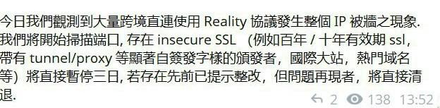 封锁原因目前尚不明确,可能是基于 IP 段的整体封禁,也可能与具体协议特征有关。大量用户反映 Reality、AnyTLS 直连均出现被墙情况。