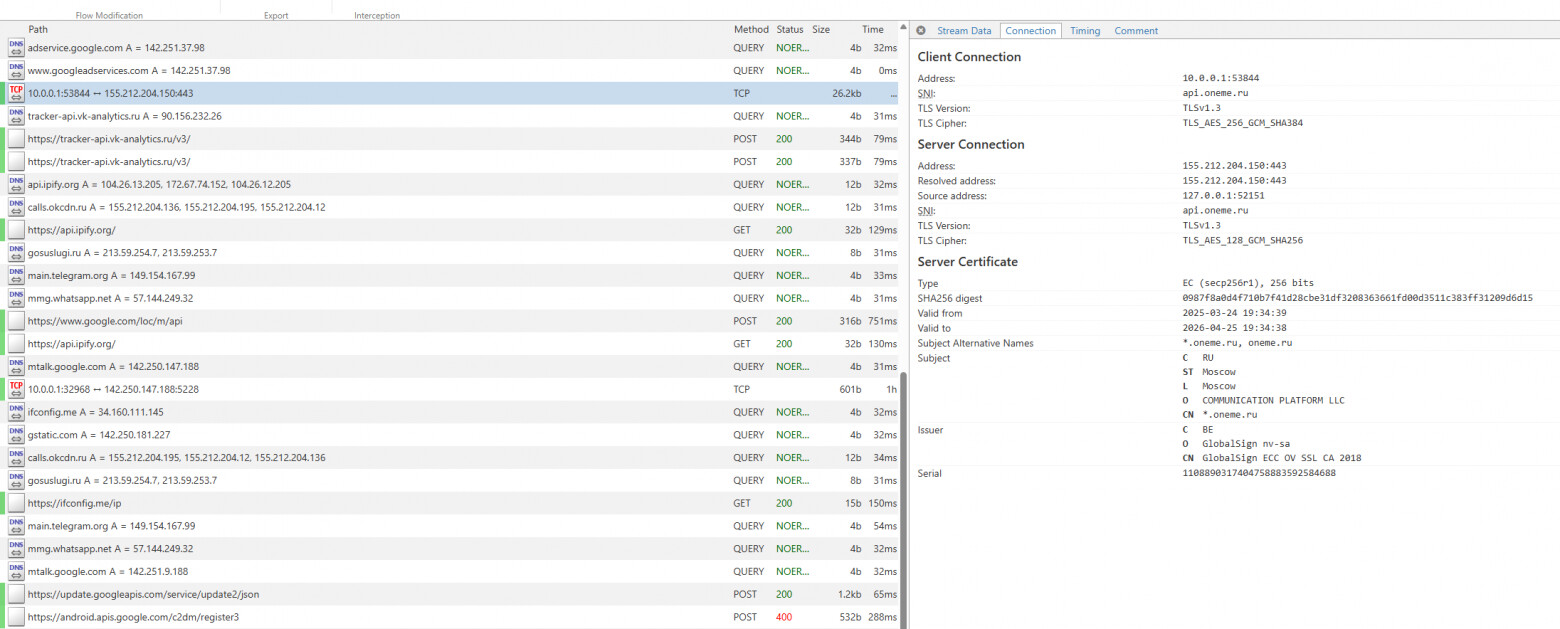 我们看到了我们感兴趣的请求,但由于某种原因,与 api.oneme.ru(即时通讯软件的 API 域)的数据交换显示为 TCP 流,而不是 HTTP(S)/WebSocket。