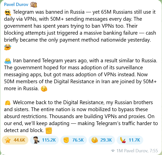 随后,杜罗夫本人也发了一篇帖子。帖子内容涉及约6500万俄罗斯用户,探讨了因网络封锁导致的银行系统崩溃,以及“数字抵抗”——总而言之,这是一篇精彩的文章。结尾的关键语句是:“我们将继续调整策略,让Telegram的流量更难被检测和封锁 。 ”
