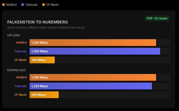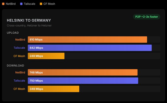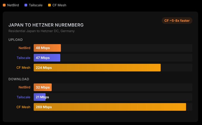 来源: Cloudflare Mesh vs NetBird vs Tailscale: Performance Compared